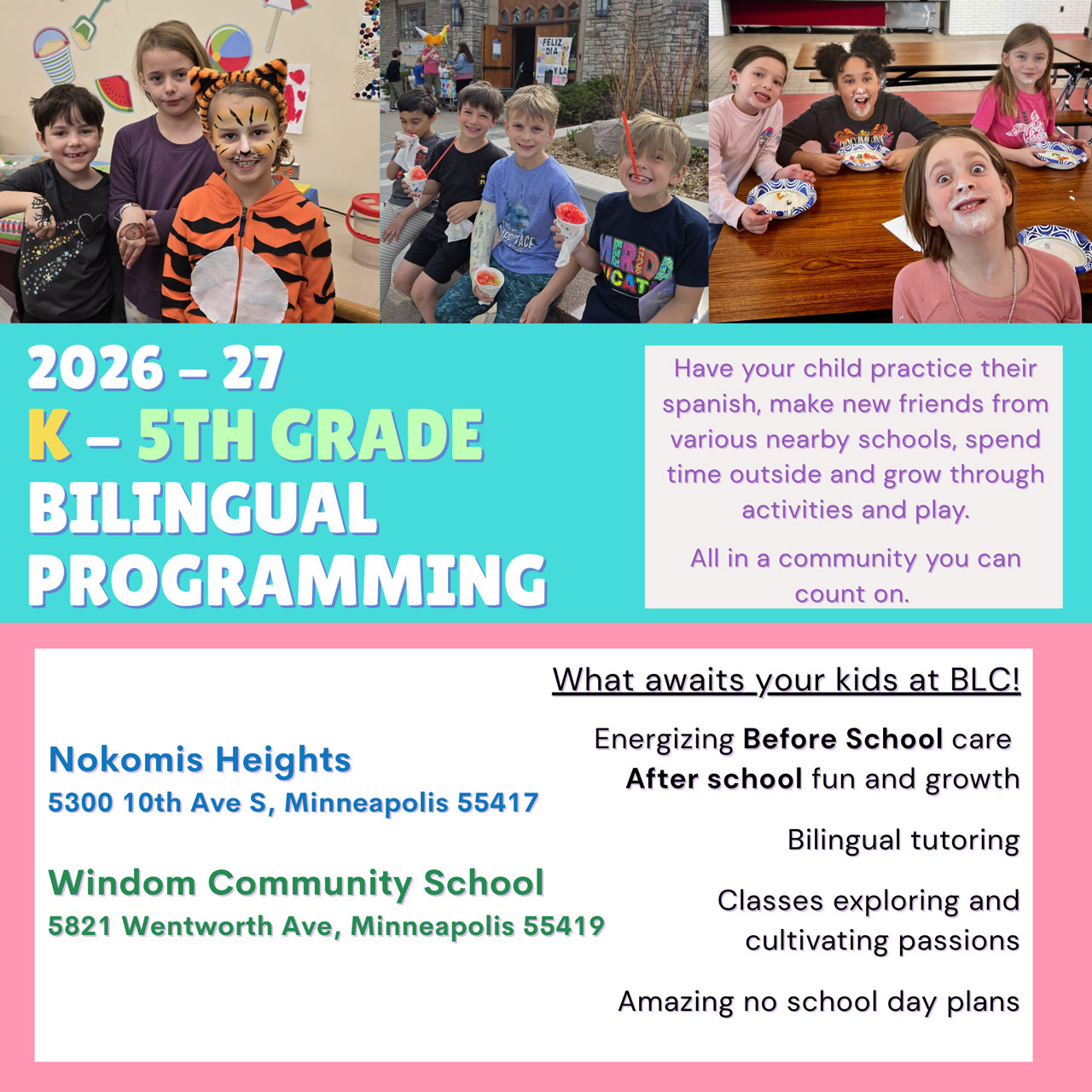 Bilingual Learning Center (BLC) is a 501(c)3 nonprofit organization that has supported families in Minneapolis since 2011. Our approach to enrichment care is through Latinx cultural immersion and the Spanish language to create a welcoming environment for all. We are dedicated to nurturing every aspect of a child’s growth and well-being through social, emotional, cognitive, and physical play while encouraging Spanish speaking and listening. Our staff come from many different backgrounds that bring unique experiences and opportunities for the children.